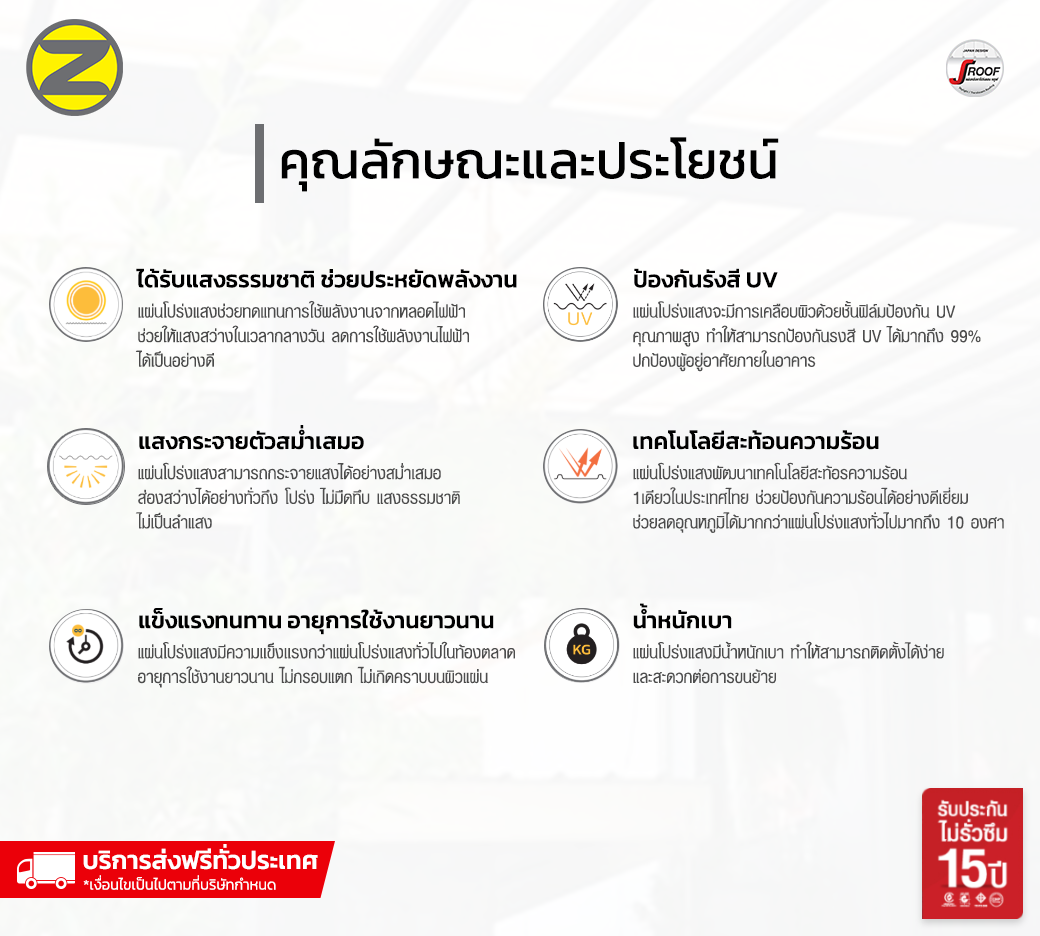 1. เป็นเกราะป้องกันรังสี UV (UV Blocker) แสงแดดประกอบด้วยความสว่างและรังสี UV ที่ทำร้ายผิวและทำให้เฟอร์นิเจอร์ซีดจาง วัสดุหลังคาโปร่งแสงในปัจจุบัน เช่น โพลีคาร์บอเนต (Polycarbonate) ไฟเบอร์กลาส (Fiberglass) หรืออะคริลิก (Acrylic) แทบทุกรุ่นจะมีการเคลือบสารป้องกันรังสี UV (UV Protection) ไว้ที่ผิวหน้า ซึ่งสามารถบล็อกรังสี UV ได้สูงถึง 99% ทำให้พื้นที่ใต้หลังคายังคงสว่าง แต่ปลอดภัยจากรังสีอันตราย